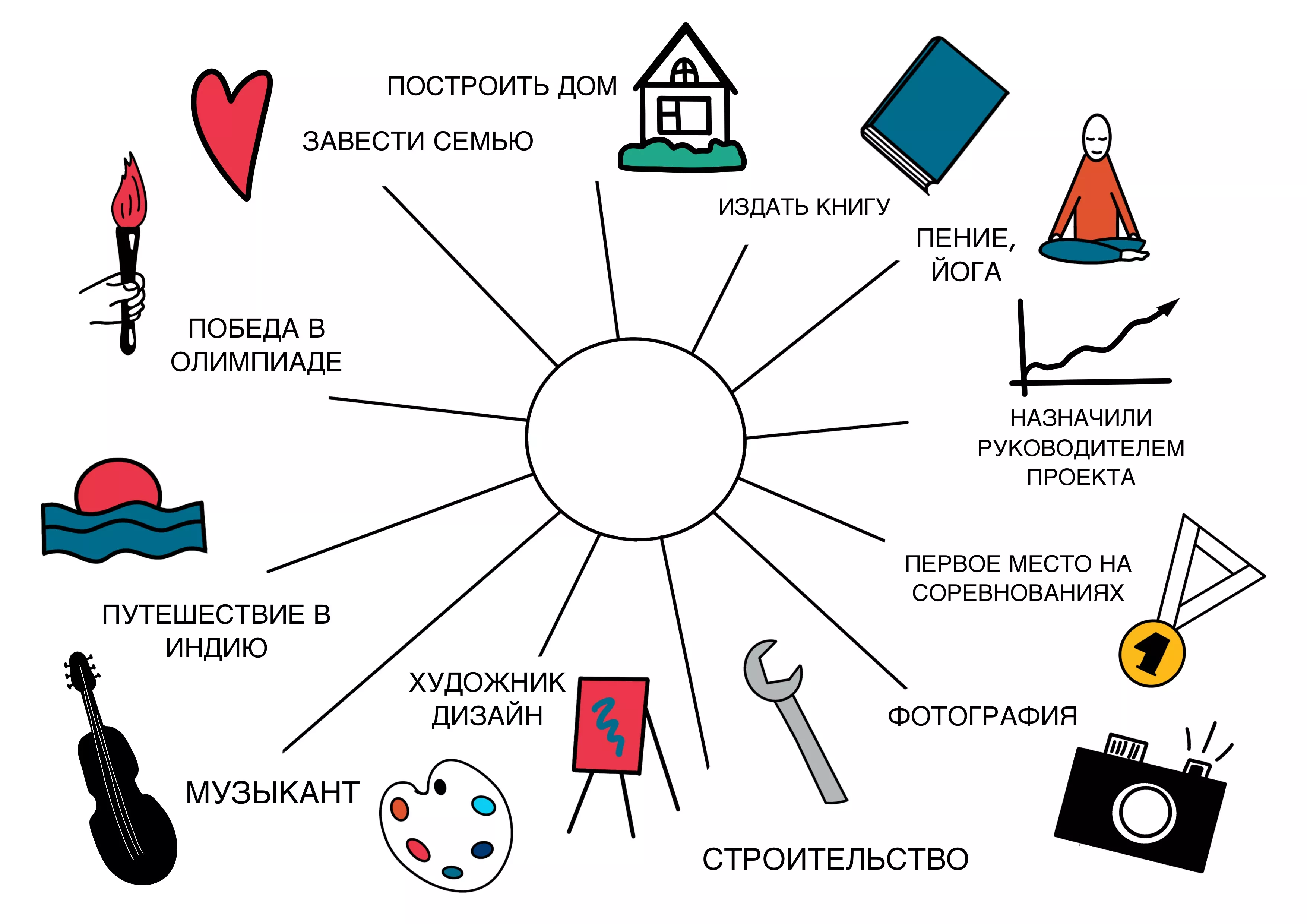 Упражнение помогает при решении сложных задач. Например, если вы хотите сменить профессию или начать ответственный проект, но сомневаетесь в выбранном направлении. Возьмите лист бумаги и нарисуйте в центре небольшой круг. Оставьте его пустым. К нему с разных сторон, будто лучи, сводите линии.